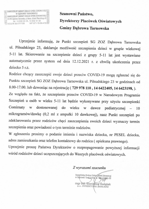 Przekazujemy Państwu informację z Samodzielnego Gminnego Zakładu Opieki Zdrowotnej o możliwości szczepienia dzieci w wieku 5-11 lat przeciw Covid-19.